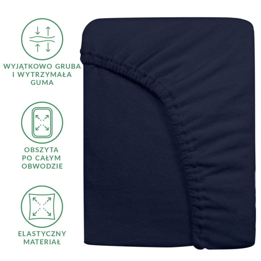 Prześcieradło z dzianiny frotte w kolorze ciemnego granatu nie mechaci się, jest odporne na przecieranie i rwanie się materiału. Nie wymaga także prasowania i nie gniecie się.