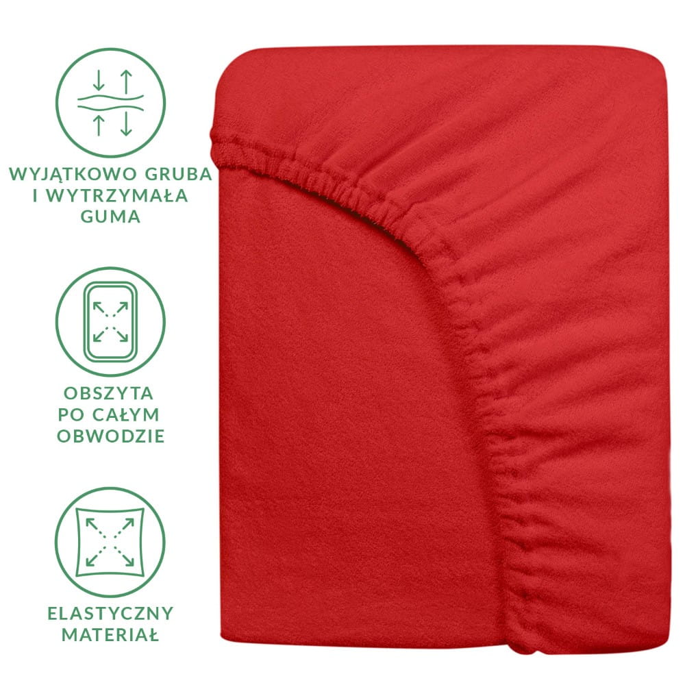 Prześcieradło z dzianiny frotte w kolorze czerwonym nie mechaci się, jest odporne na przecieranie i rwanie się materiału. Nie wymaga także prasowania i nie gniecie się.