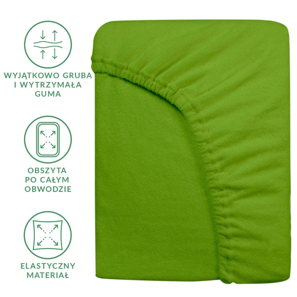 Prześcieradło z dzianiny frotte w kolorze zielonym nie mechaci się, jest odporne na przecieranie i rwanie się materiału. Nie wymaga także prasowania i nie gniecie się.