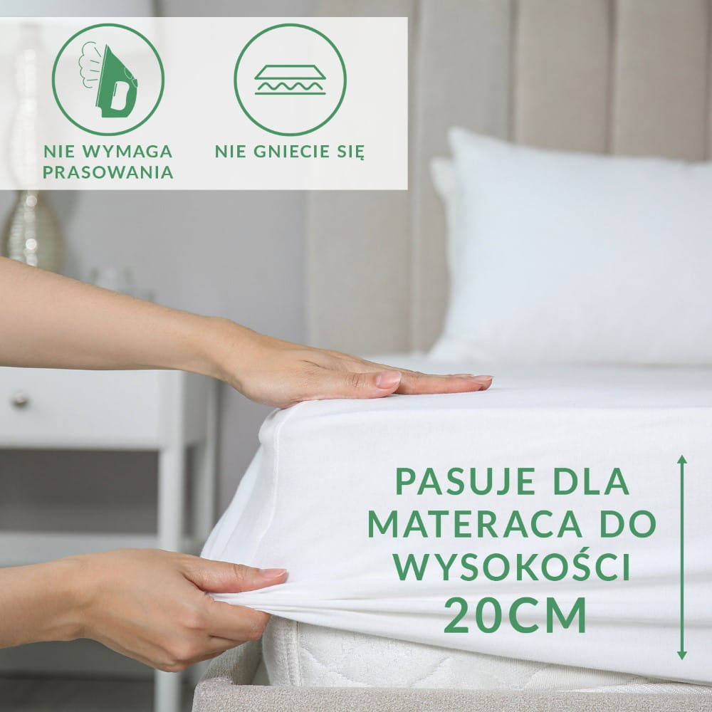 Prześcieradło jest bardzo elastyczne dzięki 18-procentowej domieszce poliestru. Dokładnie dopasowuje się do materaca o wysokości do 20 cm i idealnie przylega. Wszyta na całym obwodzie praktyczna gumka unieruchamia prześcieradło, które przez całą noc pozostaje na swoim miejscu i nie zsuwa się.