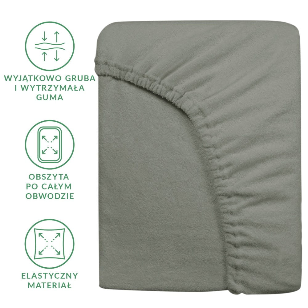 Prześcieradło z dzianiny frotte w kolorze szarym nie mechaci się, jest odporne na przecieranie i rwanie się materiału. Nie wymaga także prasowania i nie gniecie się.