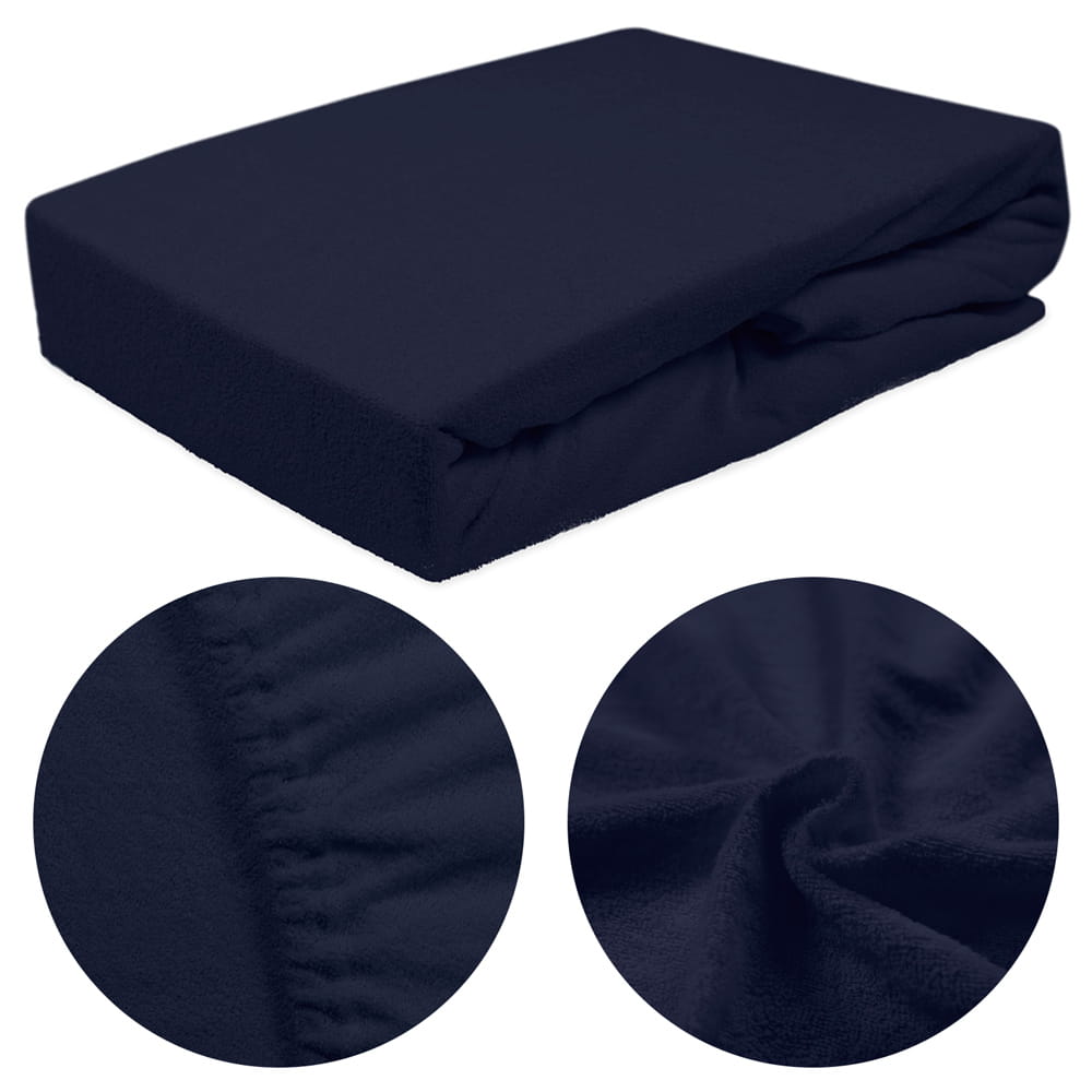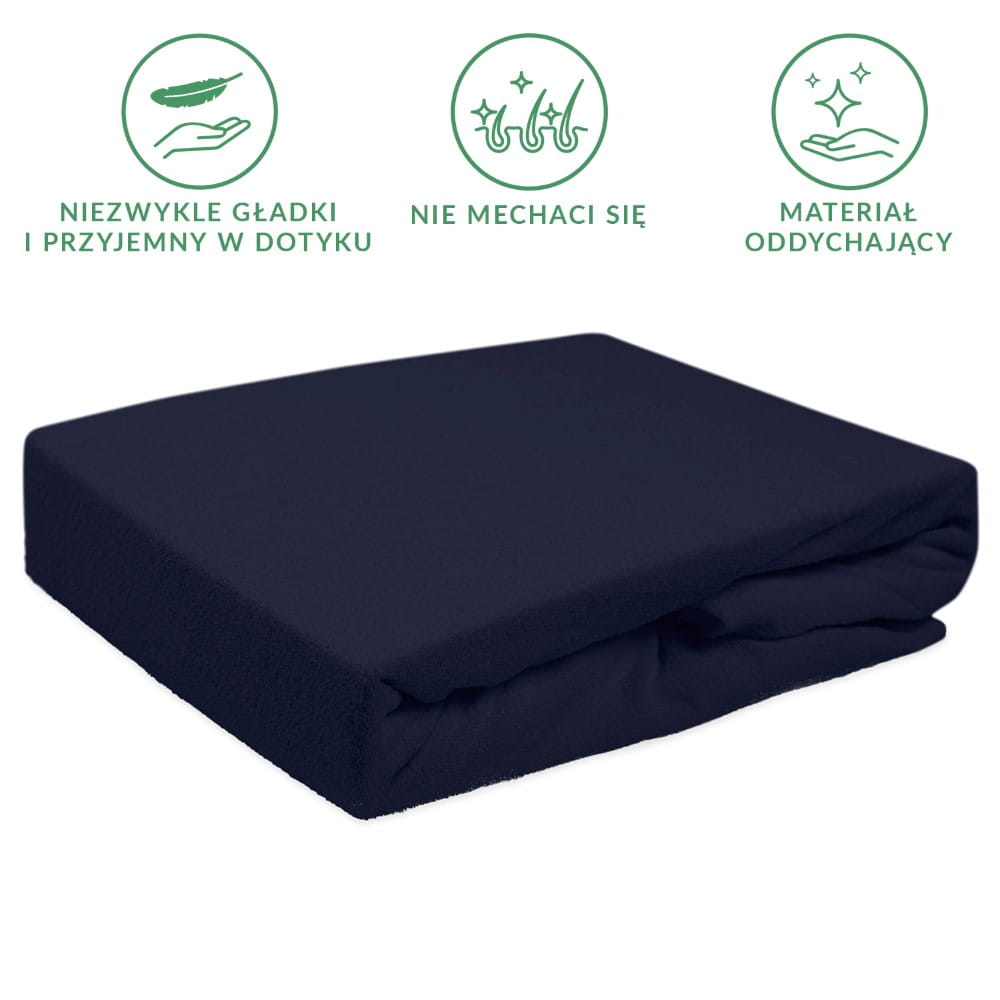 Prześcieradło z dzianiny frotte w kolorze ciemnego granatu nie mechaci się, jest odporne na przecieranie i rwanie się materiału. Nie wymaga także prasowania i nie gniecie się.