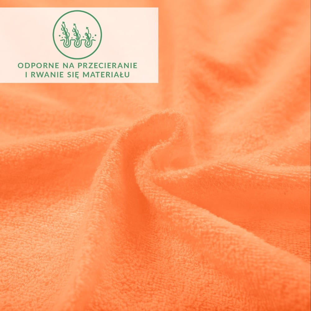 Prześcieradło z dzianiny frotte w kolorze łososiowym nie mechaci się, jest odporne na przecieranie i rwanie się materiału. Nie wymaga także prasowania i nie gniecie się.