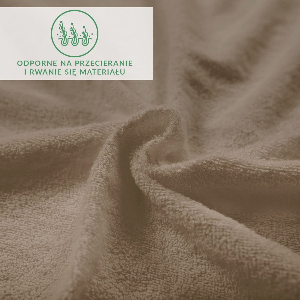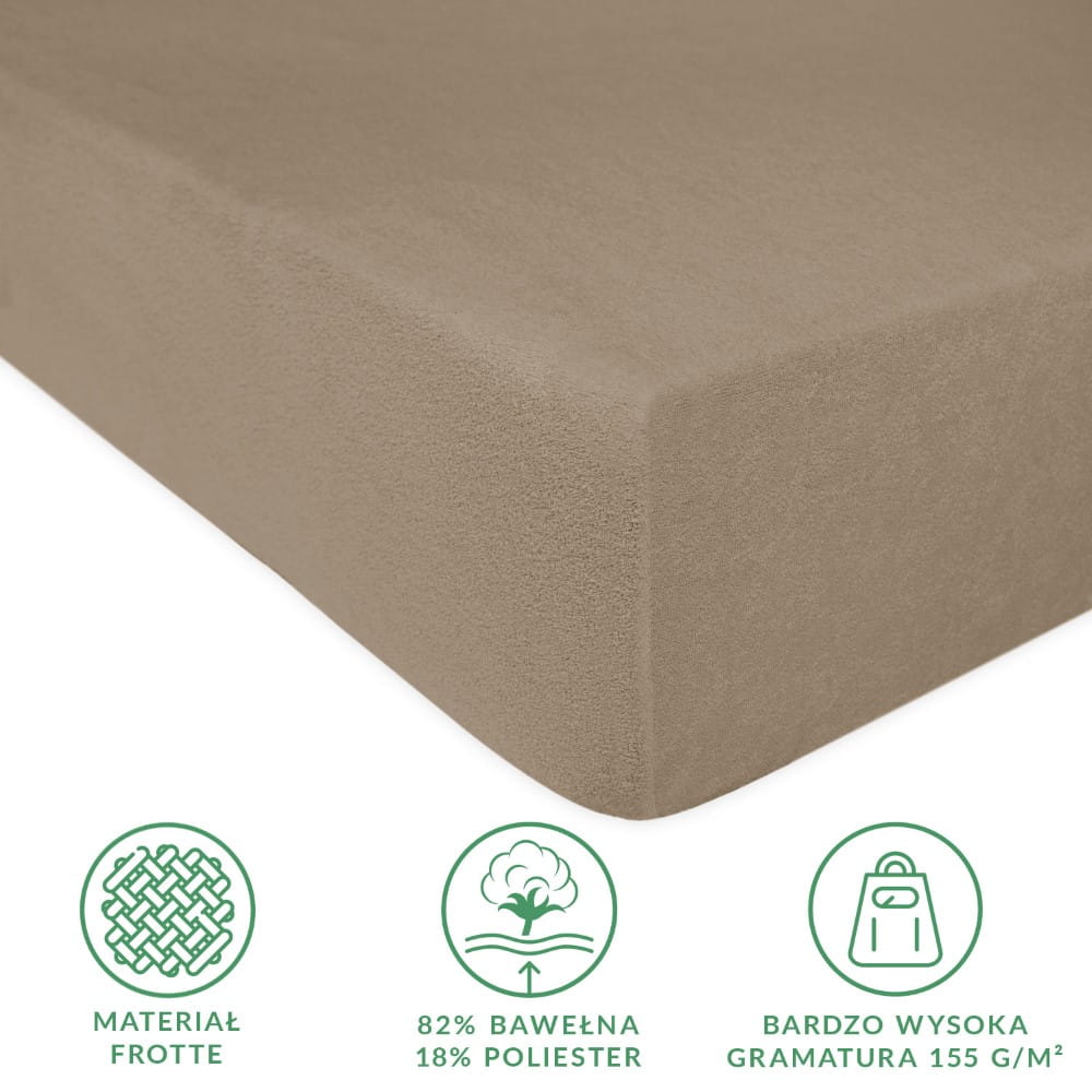 Prześcieradło z dzianiny frotte w kolorze kakaowym nie mechaci się, jest odporne na przecieranie i rwanie się materiału. Nie wymaga także prasowania i nie gniecie się.