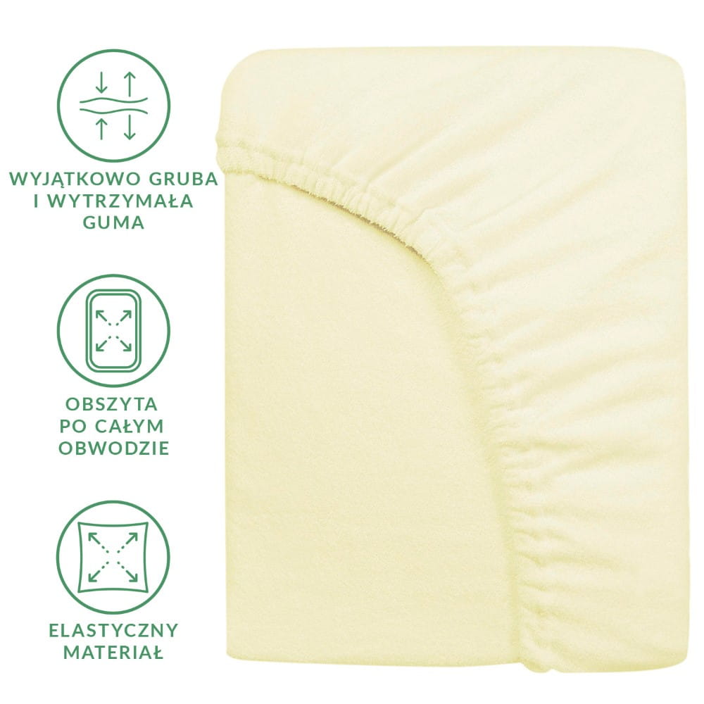 Prześcieradło z dzianiny frotte w kolorze kremowym nie mechaci się, jest odporne na przecieranie i rwanie się materiału. Nie wymaga także prasowania i nie gniecie się.