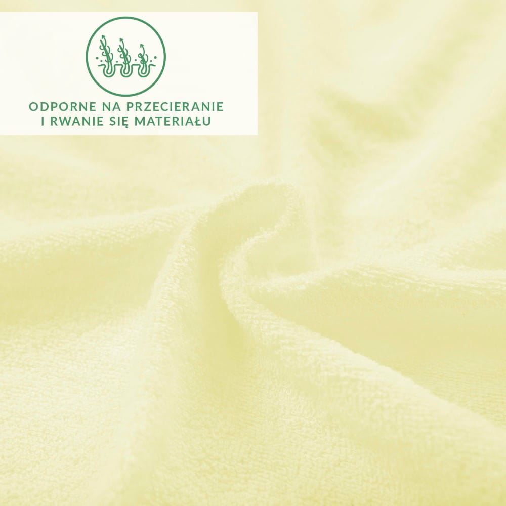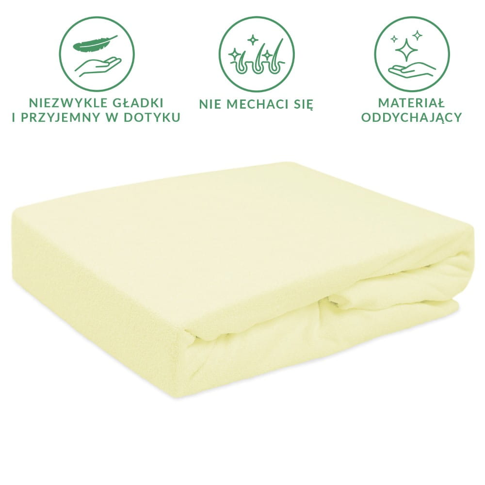 Prześcieradło z dzianiny frotte w kolorze kremowym nie mechaci się, jest odporne na przecieranie i rwanie się materiału. Nie wymaga także prasowania i nie gniecie się.