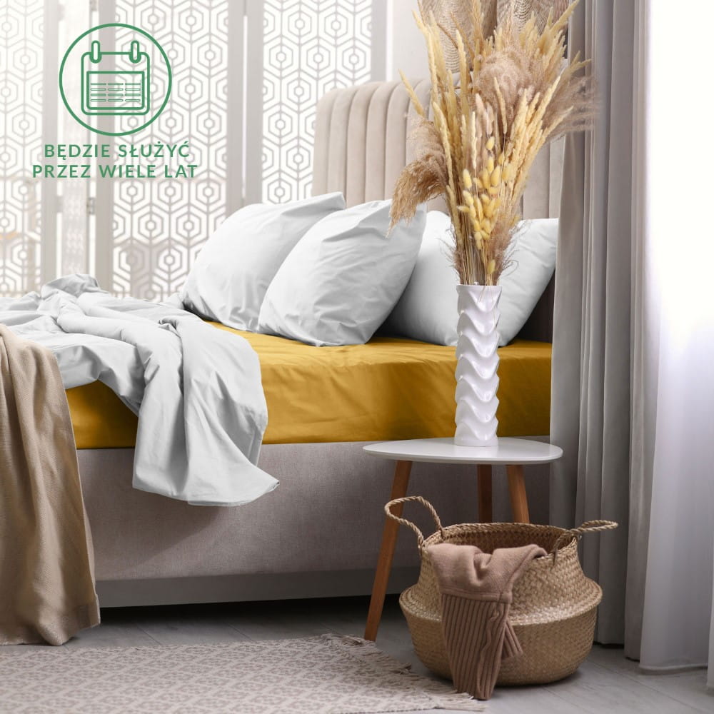 Prześcieradło z dzianiny frotte w kolorze musztardowym nie mechaci się, jest odporne na przecieranie i rwanie się materiału. Nie wymaga także prasowania i nie gniecie się.
