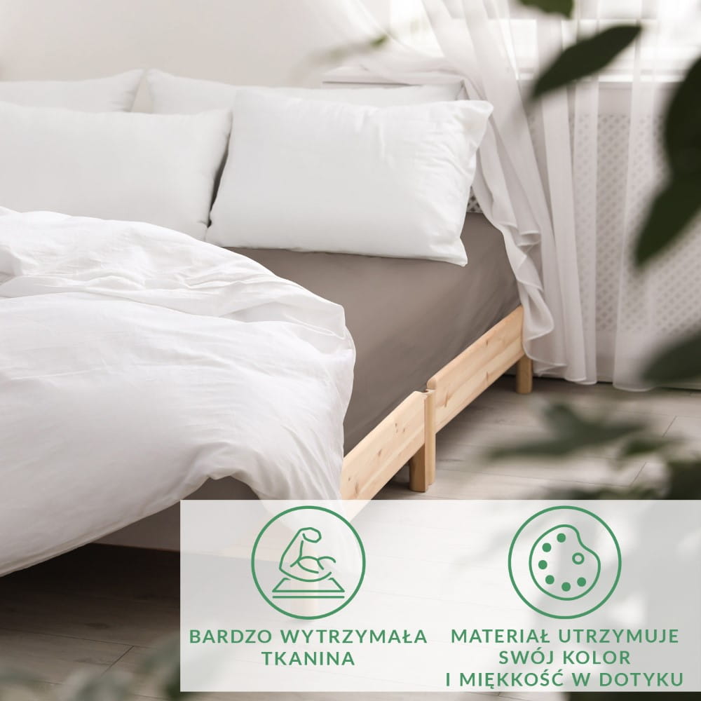 Dzięki satynowemu splotowi tkanina jest również bardzo wytrzymała, co zapewni wygodne i długotrwałe użytkowanie, bez obaw, że prześcieradło zniszczy się po kilku praniach. Materiał utrzymuje swój kolor oraz miękki efekt dotyku. Nie kurczy się, nie rozciąga i nie odbarwia, dzięki czemu możesz cieszyć się spokojnym i delikatnym snem.