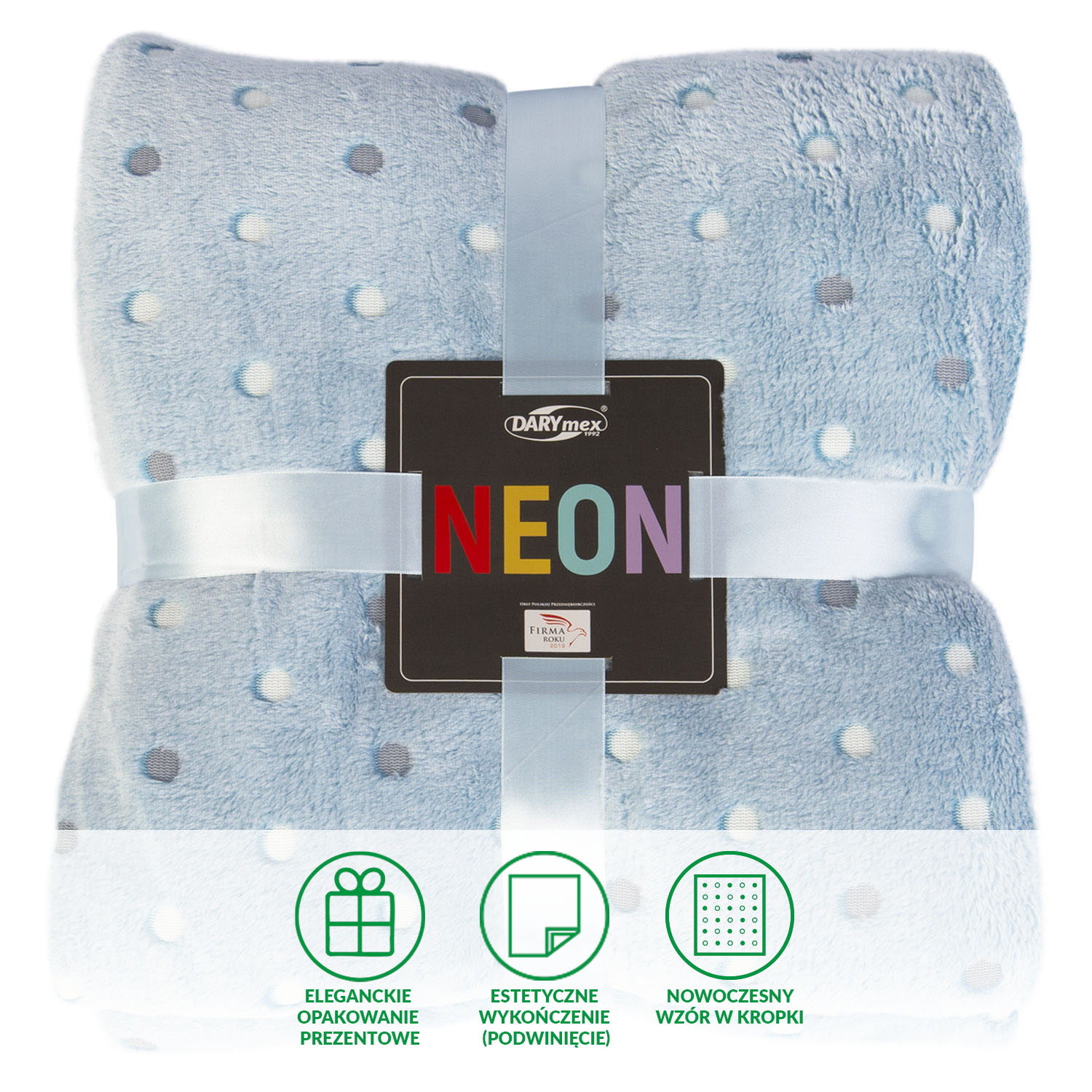 Miękki i puszysty koc z serii Neon Dots jasnoniebieski - idealny na prezent, dekoracyjny, przytulny i elegancko zapakowany, 150x200 cm