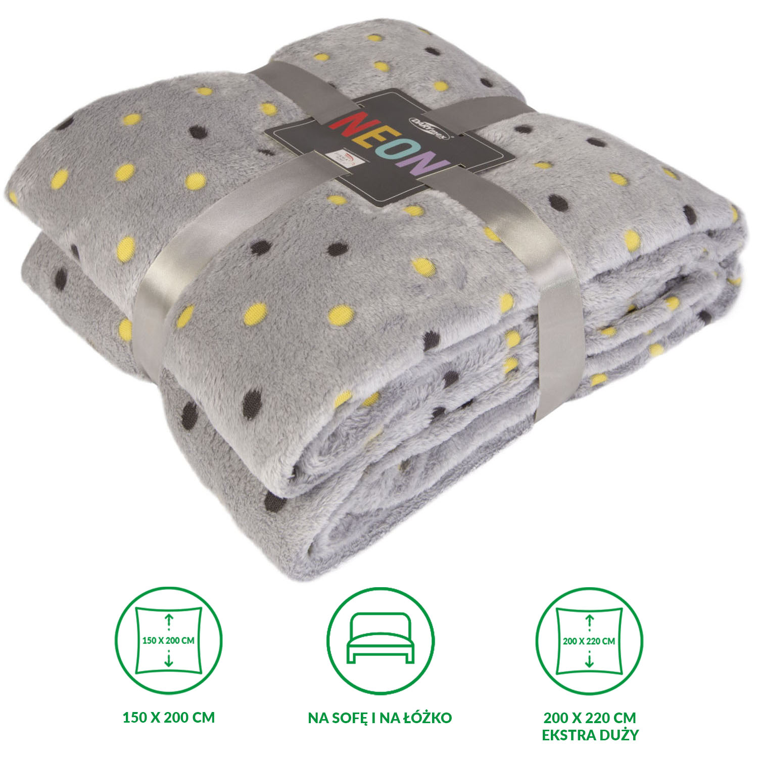 Miękki i puszysty koc z serii Neon Dots jasno szary - idealny na prezent, dekoracyjny, przytulny i elegancko zapakowany, 200x220 cm
