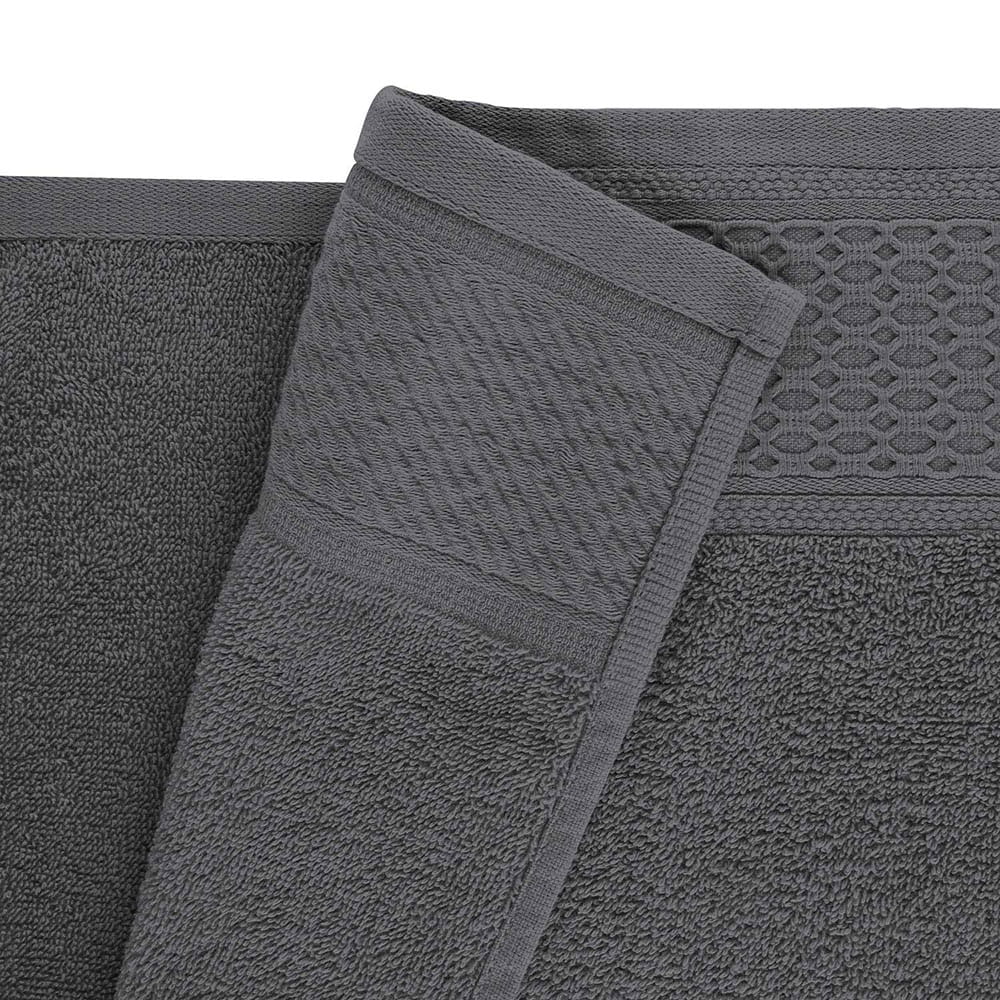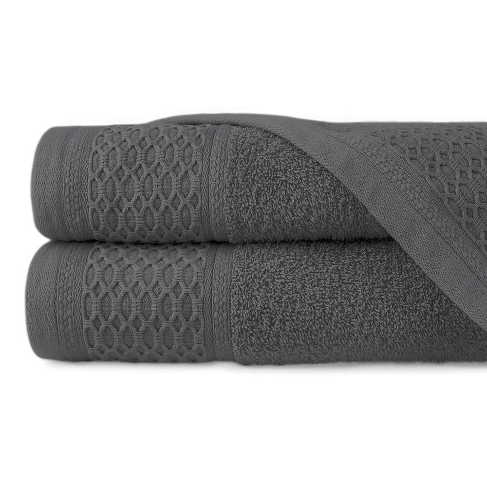Kolor ciemno szary oraz subtelna, ozdobna bordiura nadają ręcznikowi elegancki wygląd, dzięki czemu staje się nie tylko praktycznym elementem, ale również estetycznym dodatkiem do łazienki.