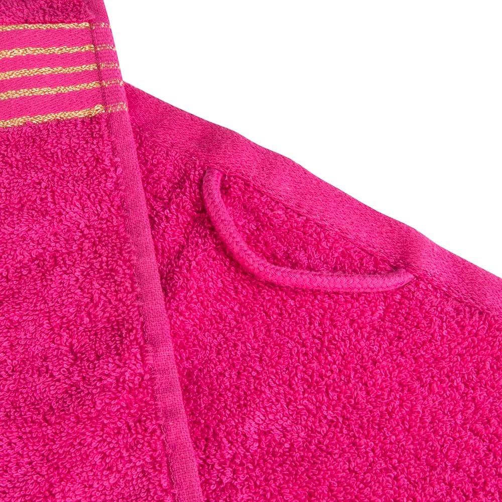 Kolor fuksja w połączeniu z elegancką bordiurą ze złotych nici nadaje ręcznikowi luksusowy charakter, dzięki czemu staje się nie tylko praktyczny, ale również dekoracyjny element łazienki.