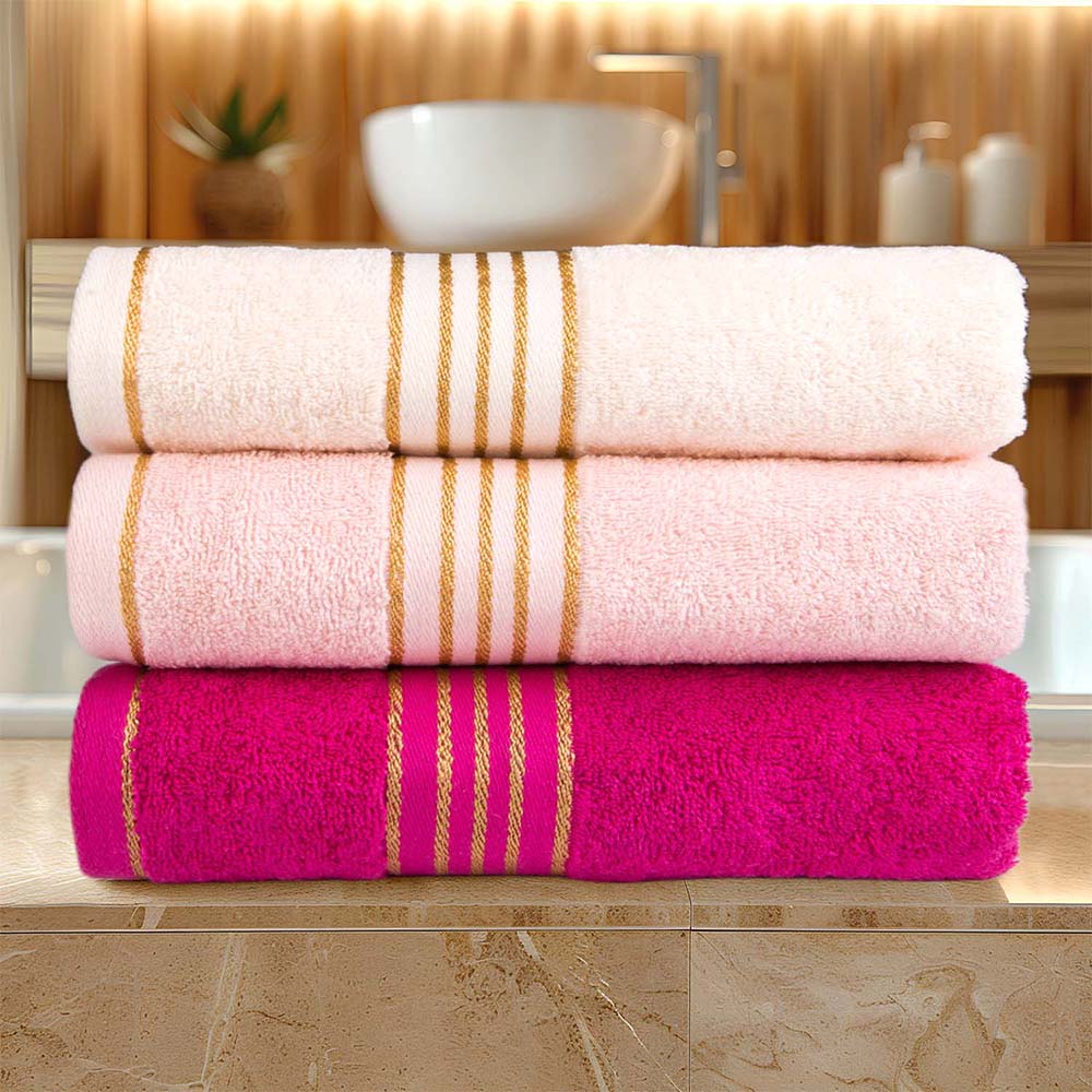 Kolor fuksja w połączeniu z elegancką bordiurą ze złotych nici nadaje ręcznikowi luksusowy charakter, dzięki czemu staje się nie tylko praktyczny, ale również dekoracyjny element łazienki.