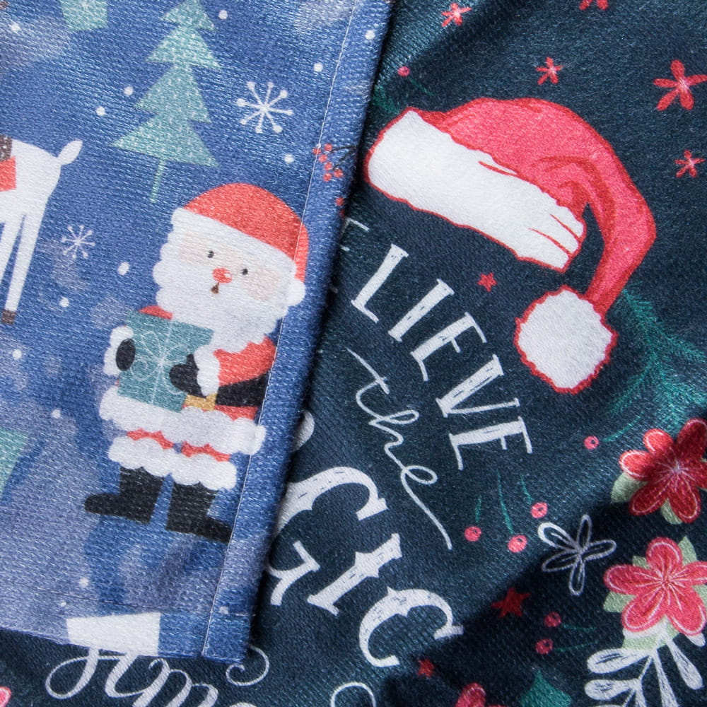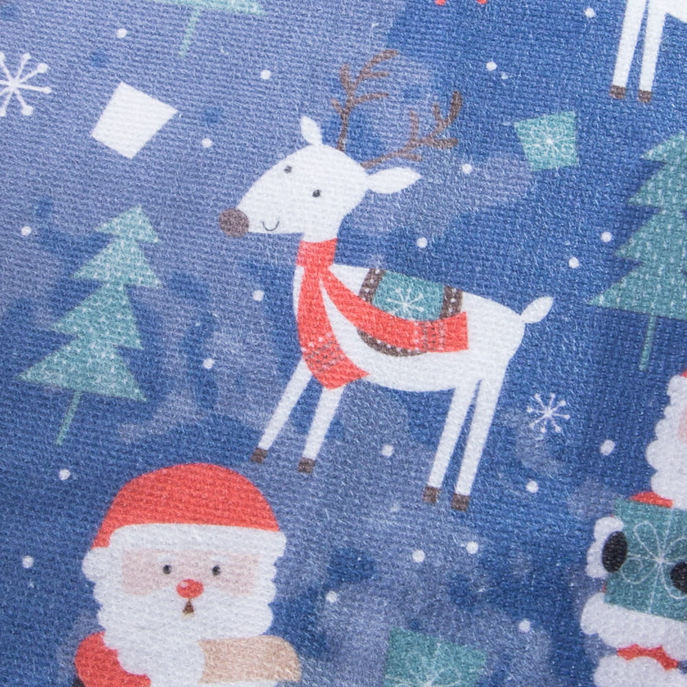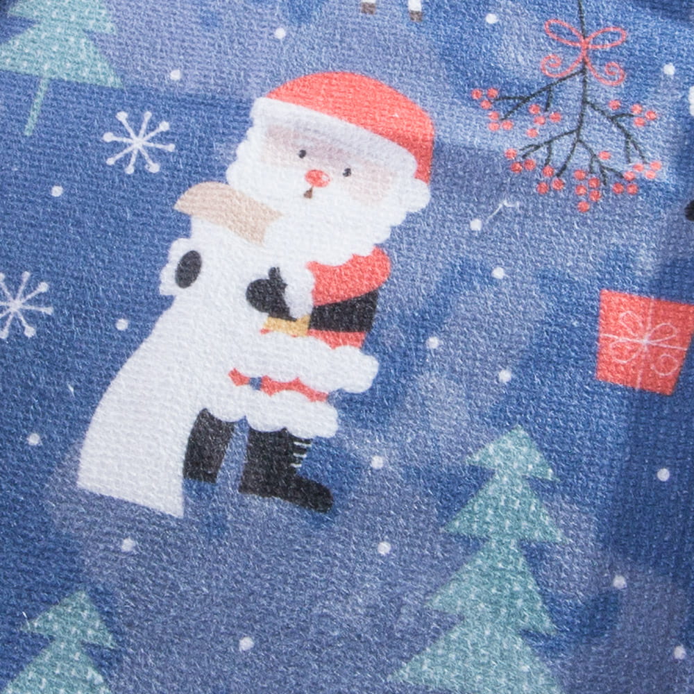 Granatowe ściereczki posiadają świąteczny wzór, jedna jest w mikołaje, a druga w świąteczny wieniec. Zostały wykończone podwinięciem. Jest to połączenie znakomitego designu z wysoką jakością produktu.