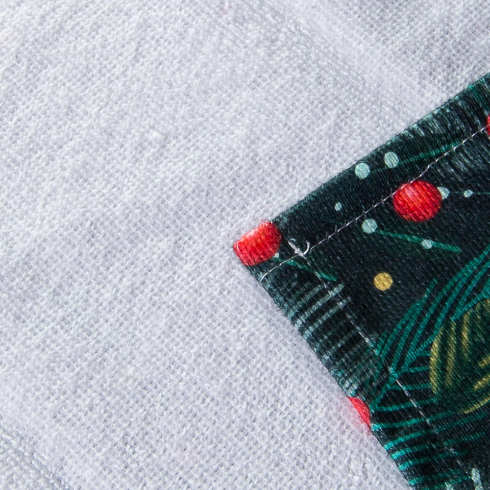 Ściereczki posiadają świąteczny wzór, jedna jest w zielone gałązki, a druga prezenty i rękawiczki. Zostały wykończone podwinięciem. Jest to połączenie znakomitego designu z wysoką jakością produktu.