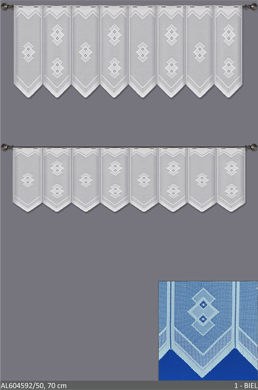 Formy płatnościSegmentowa zazdrostka żakardowa z nowoczesnym wzorem, wysoka na 70 cm. Dół wykończony wyraźnymi zębami. Można ją docinać uwzględniając cały segment o szerokości 15 cm. Boki zazdrostki nie wymagają obszycia. Aby zazdrostka ładnie się układała należy jej kupić drugie tyle, ile ma długość karnisza. Posiada otwory na drążek karnisza lub patyczek. Zazdrostka bardzo łatwa w utrzymaniu - doskonale się pierze i nie pozostają na niej najmniejsze ślady zanieczyszczeń. Bardzo dobrze przepuszcza światło i powietrze. Doskonale sprawdzi się w kuchni.