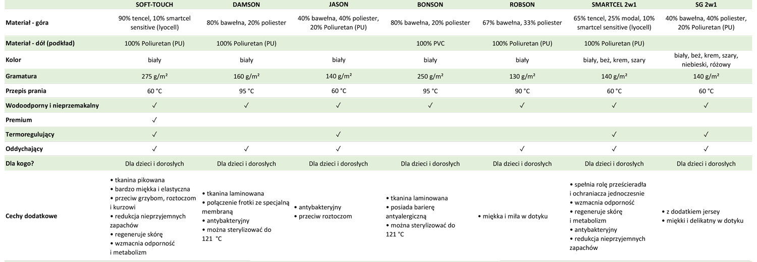 Wodoodporny z całkowitą ochroną przed wszelkiego rodzaju płynami i zanieczyszczeniami. Mocowany do materaca za pomocą grubej gumy wszywanej w każdym rogu ochraniacza.